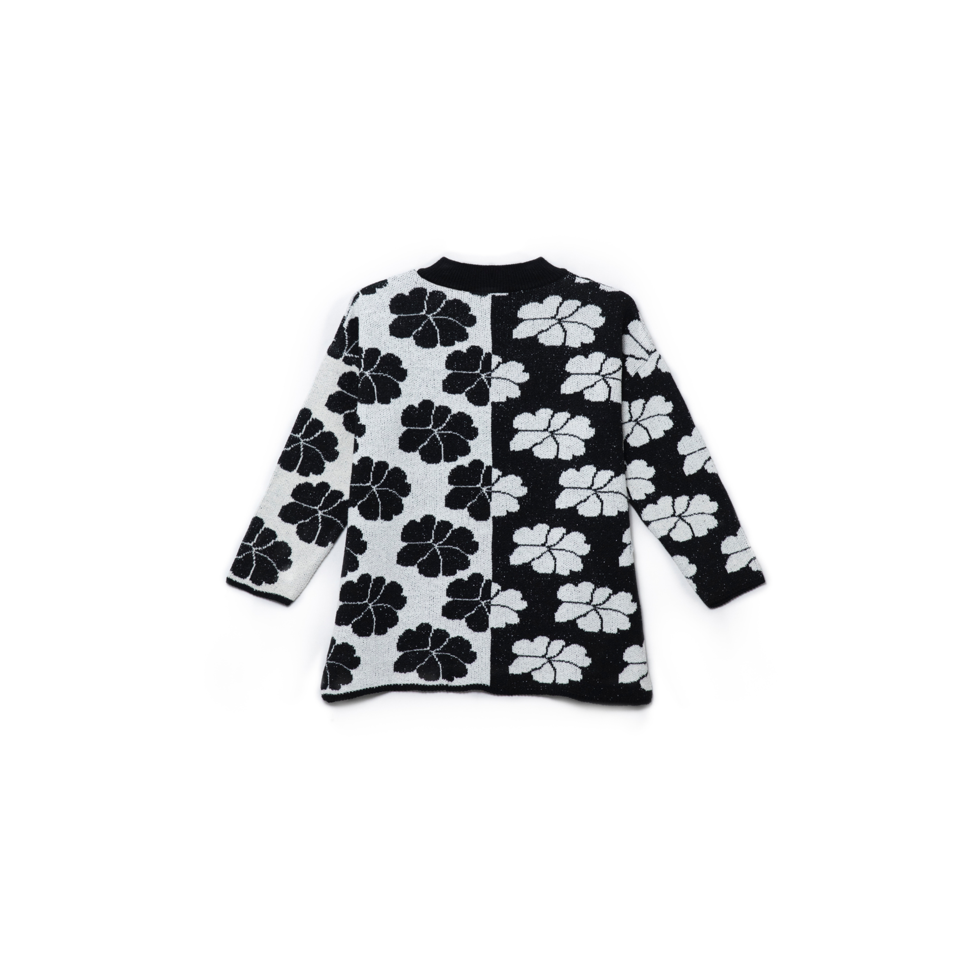 Make a statement with this striking Floral Sweater featuring a bold design — one side in classic black, the other in crisp white, beautifully complemented by floral accents in maroon and white. This eye-catching combination blends edgy contrast with soft, feminine detail.