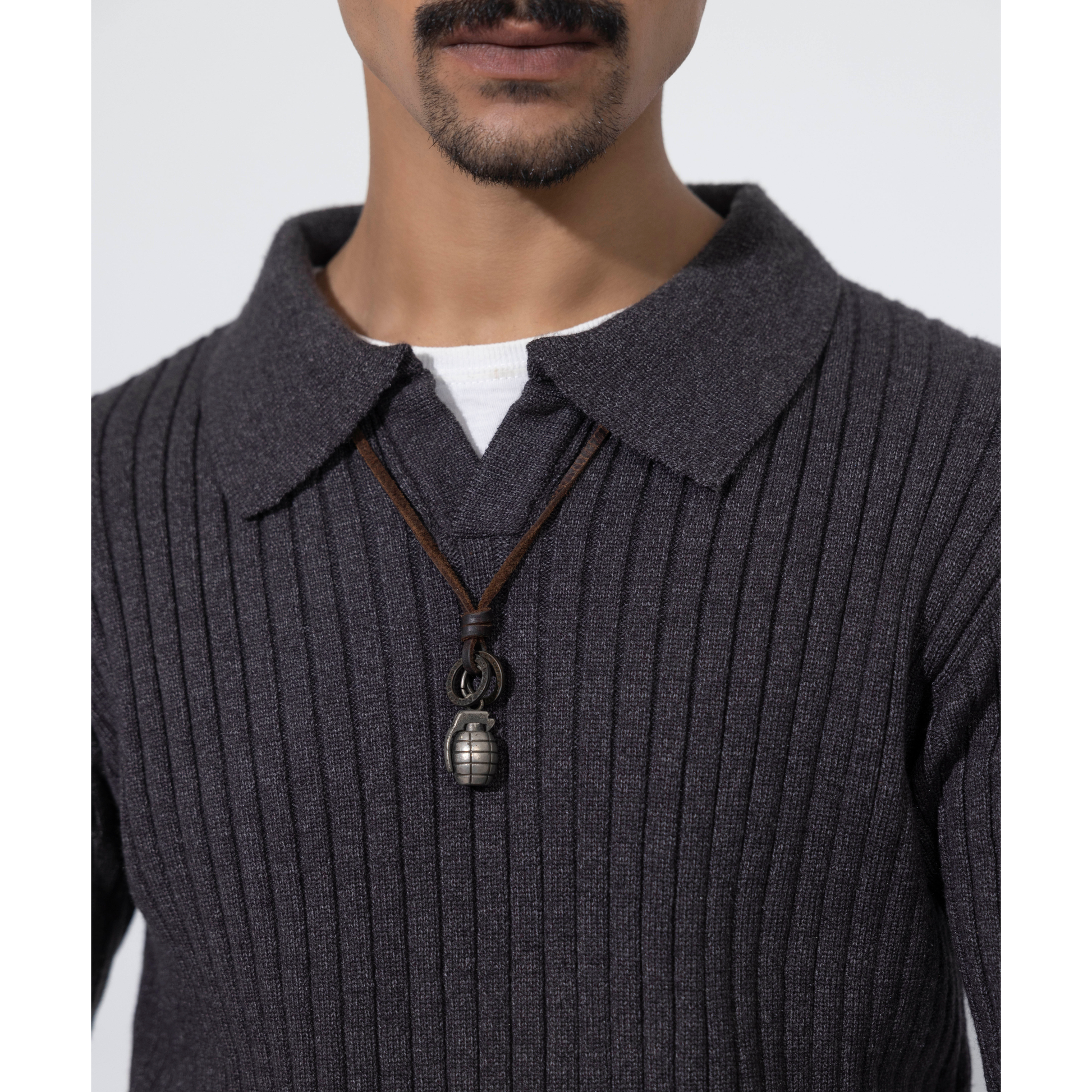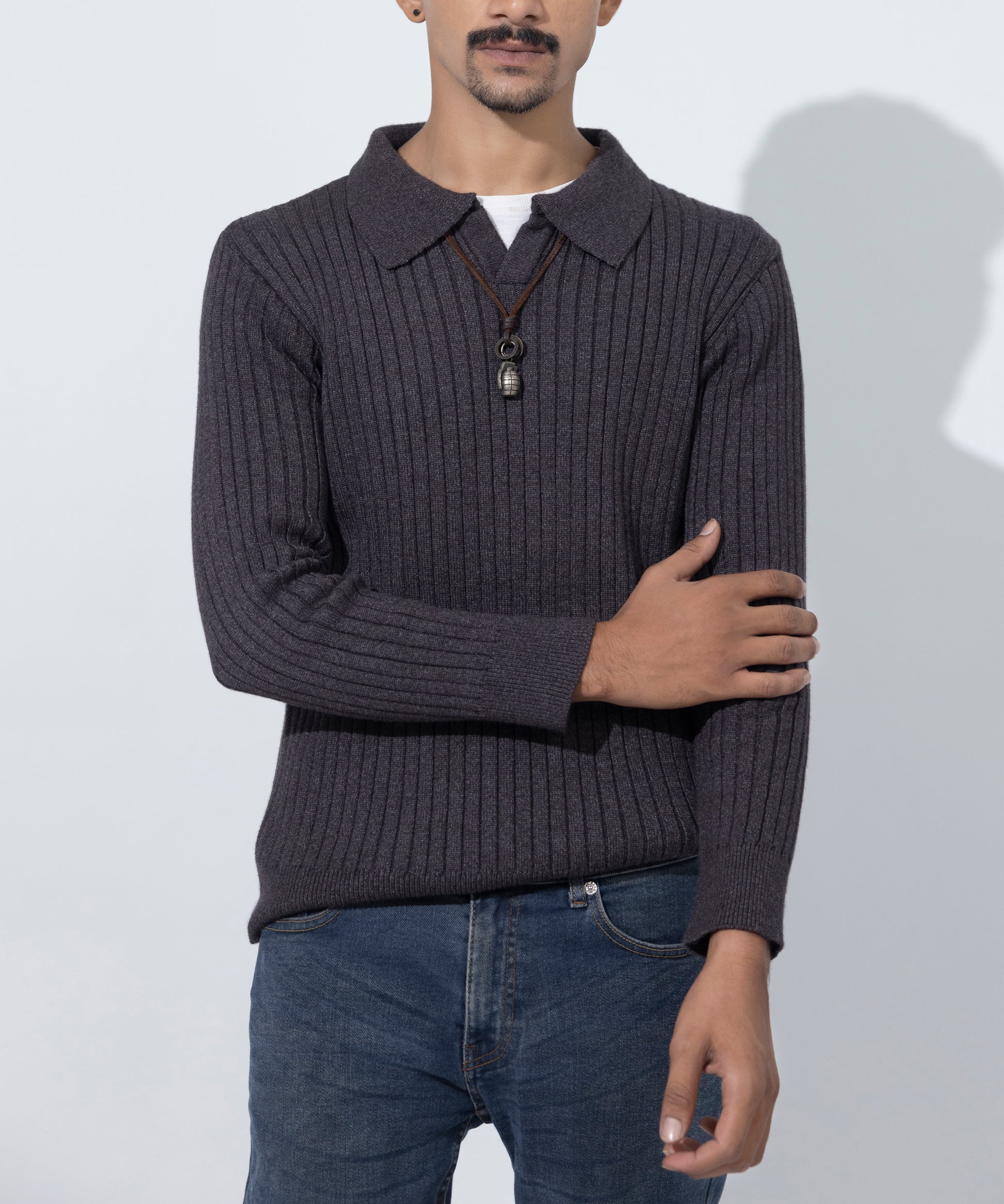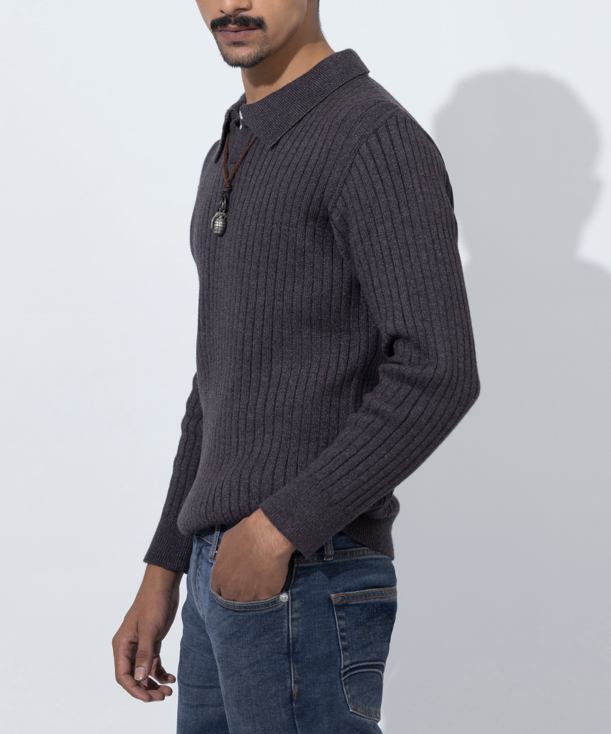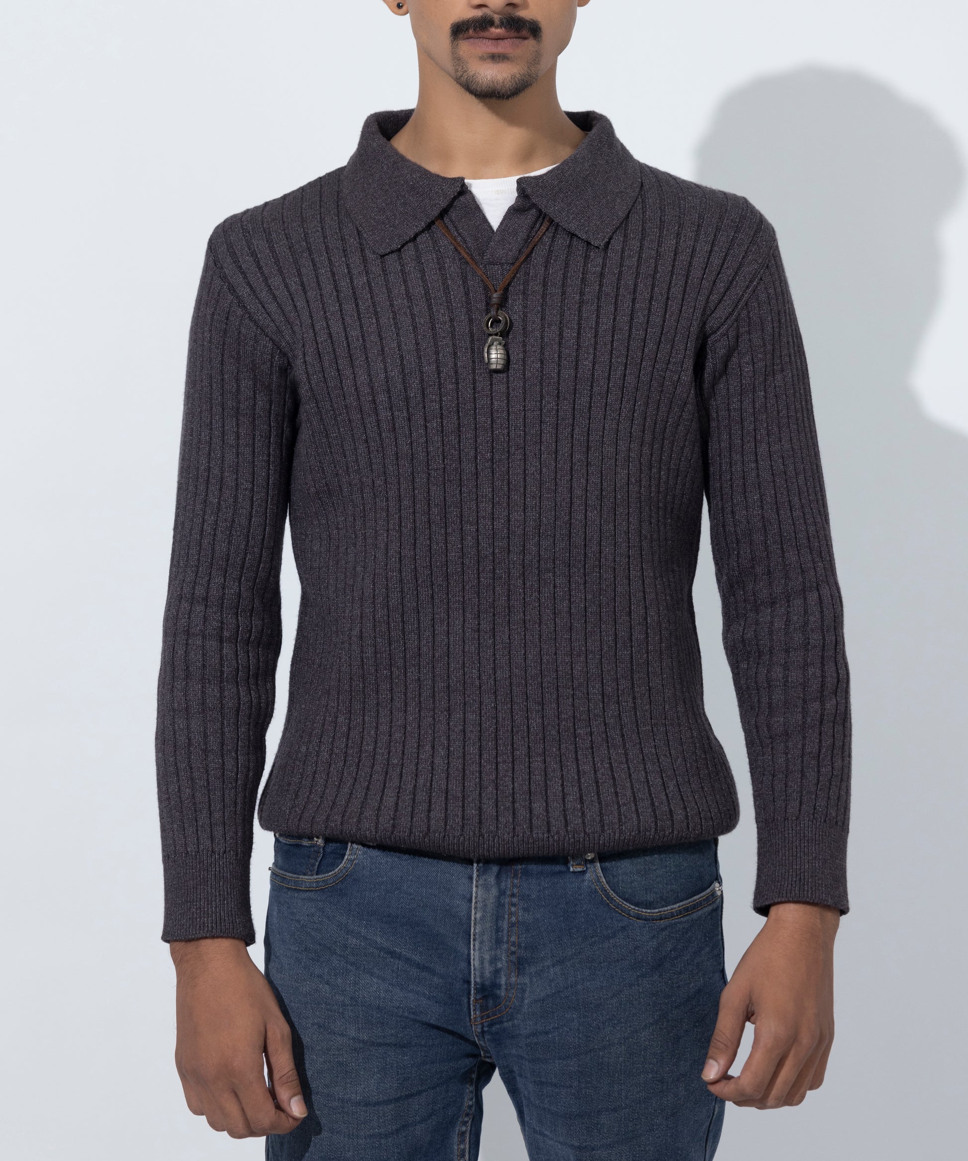 This vertical‑rib knit collar sweater for men combines classic structure and textured knit for refined warmth and style.